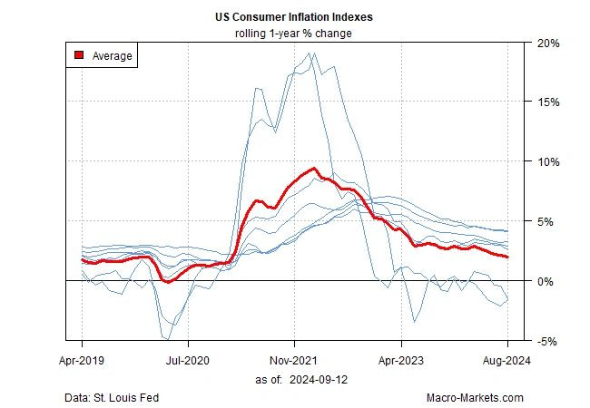 Finally, consider how a set of alternative inflation indicators stack up. The logic here is that the standard consumer price indexes published by the Labor Dept. may be flawed in some degree. Indeed, any one measure of inflation reflects a particular set of pros and cons. Expanding the data set to a range of indicators offers the opportunity to strengthen the analytics and calculate a closer approximation of the true inflation rate. On that basis, estimating the average change in CPI via a broader set of inflation benchmarks arguably provides a clearer measure of the trend, which continues to reflect ongoing disinflation.