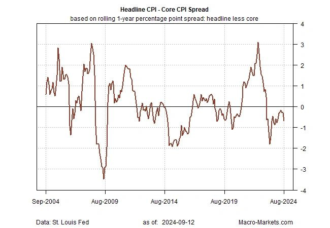 One way to measure the overall inflation bias is monitoring the spread for headline and core CPI on a rolling one-year basis. History suggests this measure provides a rough estimate of the strength or weakness of disinflation. When the spread is negative, as it currently is and has been for a year-and-a-half, that’s a sign that the disinflationary bias is relatively strong. On that basis, disinflation momentum remains robust.
