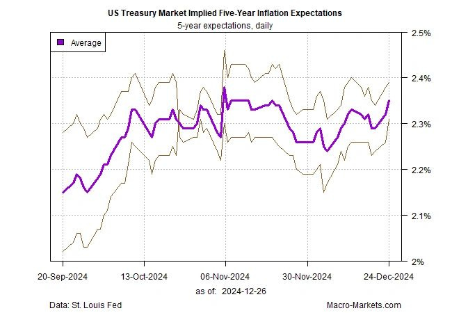 The Cleveland Fed’s inflation expectations model offers an ex ante view and on that basis it’s clear that a whiff of reflation has returned recently. The question is whether the latest upturn pushes above the previous highs (roughly 2.7%). Until then, it may reasonable to assume that the upturn is noise.