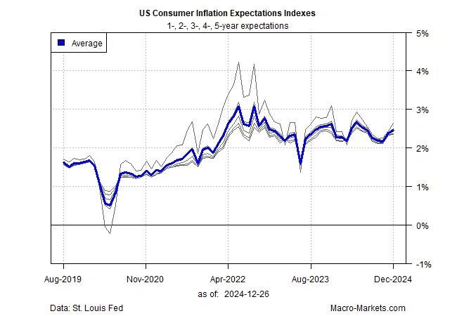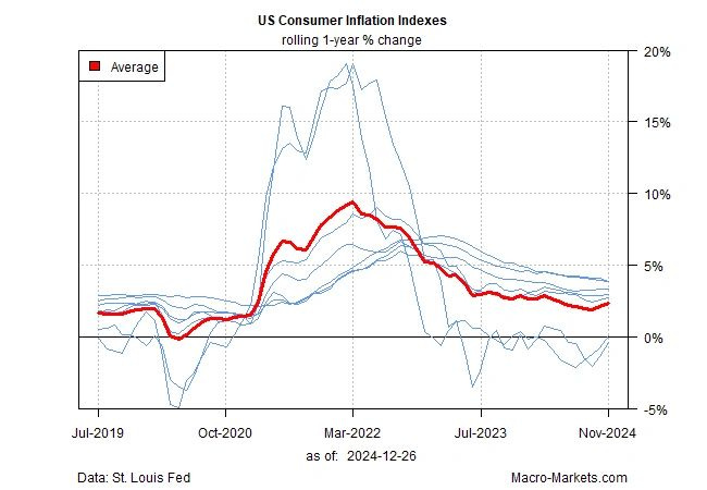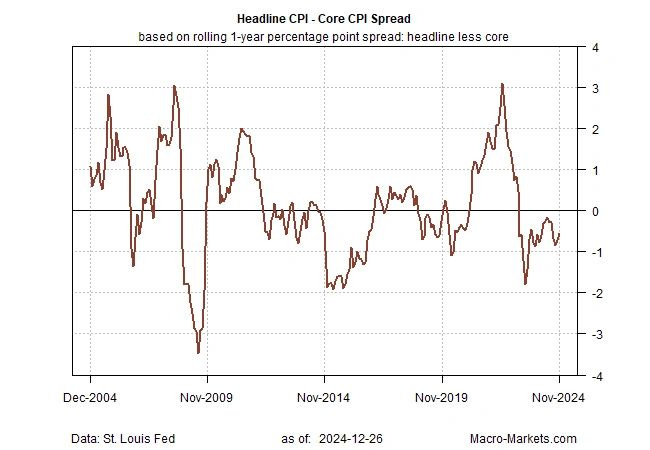One way to measure the overall inflation bias is monitoring the spread for headline and core CPI on a rolling one-year basis. History suggests this measure provides a rough estimate of the strength or weakness of inflationary pressure. When the spread is negative, as it currently is and has been for a year-and-a-half, that’s a sign that the disinflationary bias is relatively strong. On that basis, disinflation momentum remains robust. The drawback to this metric is that it’s backward-looking and is starting to conflict with forward-looking indicators that appear to shifting to a reflationary bias again in December, as shown below.