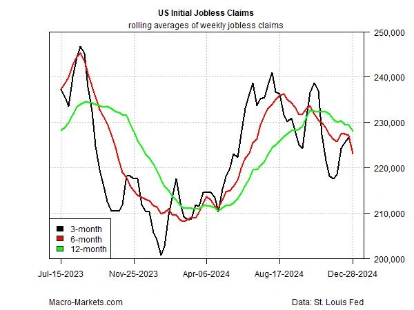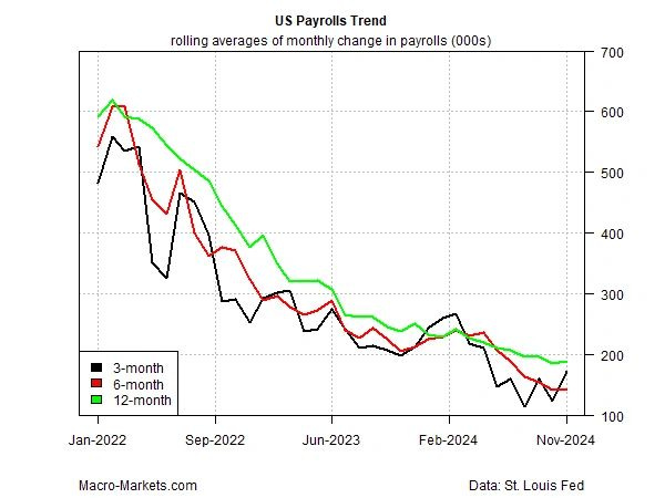 Hiring slowed through much of 2024, but a firmer round of growth emerged in the fourth quarter. The 3-month moving average of monthly changes in nonfarm payrolls rebounded to 173,000 in November, the highest since May. (Moving averages help smooth out the misleading noise that sometimes distorts monthly comparisons.)