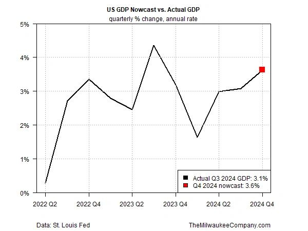 The sharp upward revision from the previous estimate on Dec. 10 (“Slower Growth, But No Recession: US Q4 GDP Nowcast”) should be viewed cautiously. As always with nowcasts and forecasts, there’s a wide range of uncertainty around the point estimate. But the fact that a wide range of published economic data that’s used to generate the nowcast indicates a strong pace of growth for Q4 suggests that recession risk is low and US output ended 2024 with a vigorous tailwind.