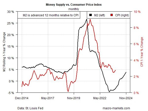 Fed funds futures appear to be pricing in high odds that the central bank will leave its target rate unchanged at a 4.25%-4.50% range at the next policy meeting on Jan. 29. The question is whether incoming inflation data will persuade the Fed to start raising interest rates again? Using the one-year M2 money trend as a guide suggests that inflation looks increasingly likely to hold steady or edge higher, which implies that the Fed will be forced to pause on rate cuts for the foreseeable future.