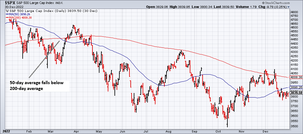 Using a single pair of moving averages to date the start of a bear market oversimplifies the necessary analytics for robustly evaluating the market’s trend bias in real time. Yet this example is a useful first approximation for assessing the trend today vs. 2022. For comparison, here’s how the S&P 500 currently stacks up: