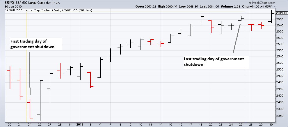 During the most-recent shutdown in 2018-2019, which lasted 35 days, the stock market (S&P 500 Index) rallied: