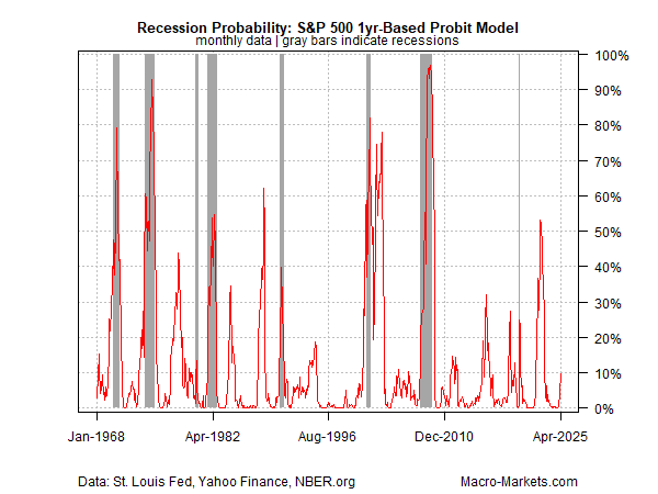 A third model estimates recession risk via the rolling 1-year return on the S&P 500 and then runs the results through a probit model. To filter out some of the noise that affects the daily frequency in the analysis above, the model shown below uses the monthly average of daily data. The results are arguably more reliable, or at least less noisy. The current recession probability nowcast via the monthly analysis shown below is nearly 10% for the April estimate, based on this month’s average for S&P 500 data through yesterday’s close (Apr. 9).