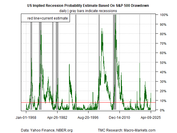 Accordingly, the stock market is a useful addition to the macro toolbox for monitoring the economic outlook. A reasonable first approximation is extracting the market’s implied probability for recession risk from drawdown. The logic: When the market falls, it could be a sign that investors are becoming worried that the economy is weakening.