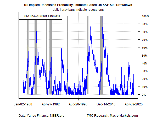 As a first step, we can use the S&P 500 Index’s drawdown as a rough approximation of the market’s “thinking” for economic expectations. The further the market falls from the previous peak, the higher the implied odds that the crowd’s worried about the growth prospects.