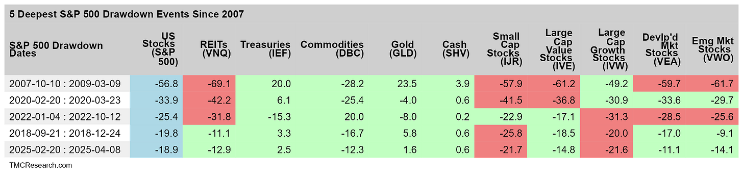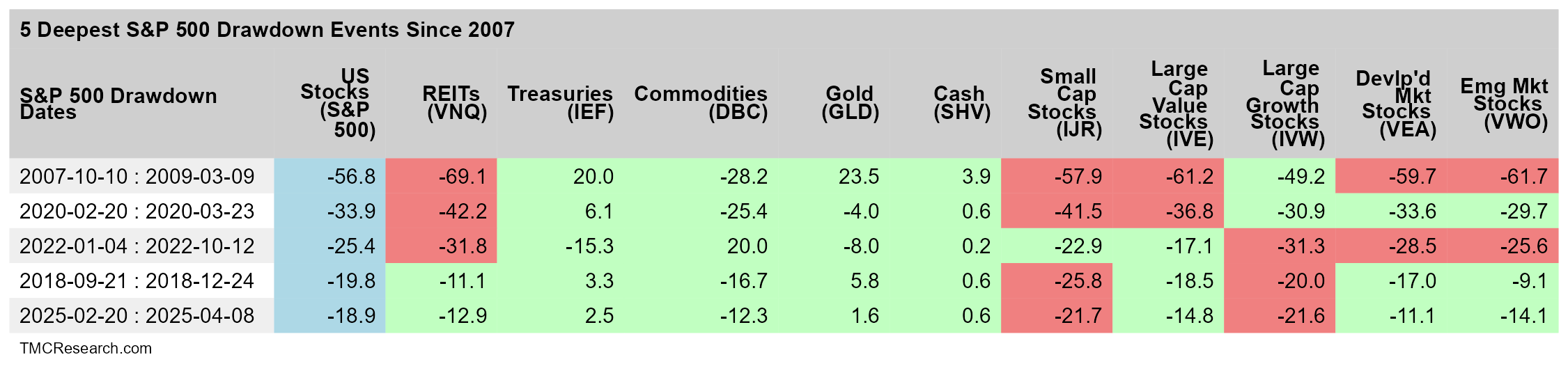 Some asset classes – such as Treasuries (IEF) – have routinely outperformed US stocks during the steepest drawdowns in recent history.
