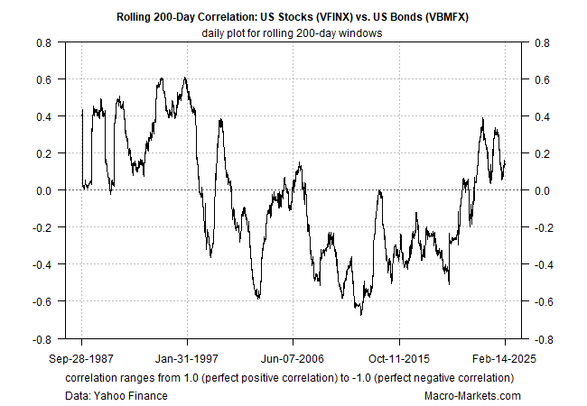 Since mid-2022, the daily return correlation between stocks and bonds has been moderately positive, based on a pair of index funds (see chart below). That reflects a stark shift after roughly two decades of mostly negative correlations, based on rolling 200-day windows for daily returns.