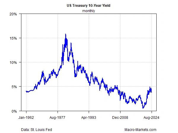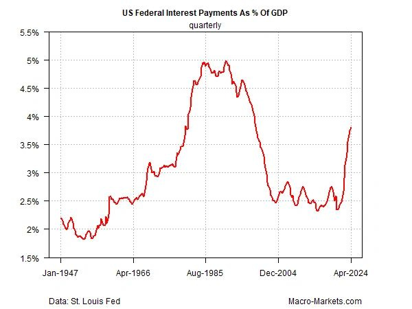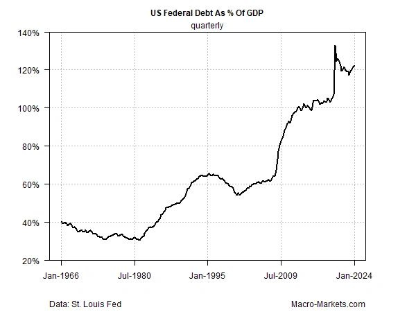 Ignoring the risk is naïve, but panicking is premature. Instead, it’s prudent to understand this risk factor as a foundation for managing expectations and making informed decisions. Let’s start with a metric that’s become alarming for some analysts: US federal debt as a of percent of the economy (GDP). As the chart clearly shows, the debt burden has increased over the years, with a spike during 2020 when pandemic-related spending surged. The burden has eased in the last three years, but the current percentage – 122% as of 2024’s first quarter – remains far above the percentage that prevailed pre-pandemic.