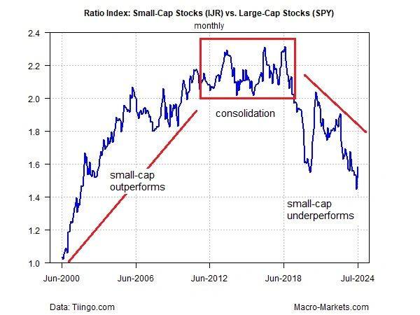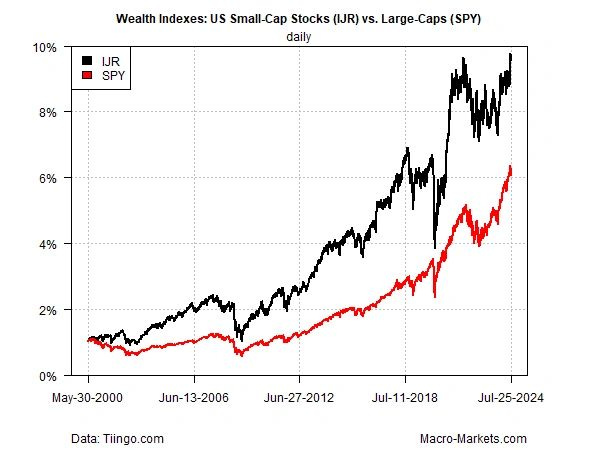 But there are hints that 2024 may be a turning point that marks the start of a new regime of small-cap outperformance. Over the past month, IJR has dramatically outperformed SPY: 11.5% vs. an essentially flat performance for SPY, through July 26.