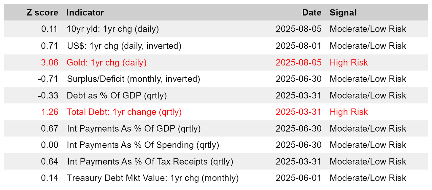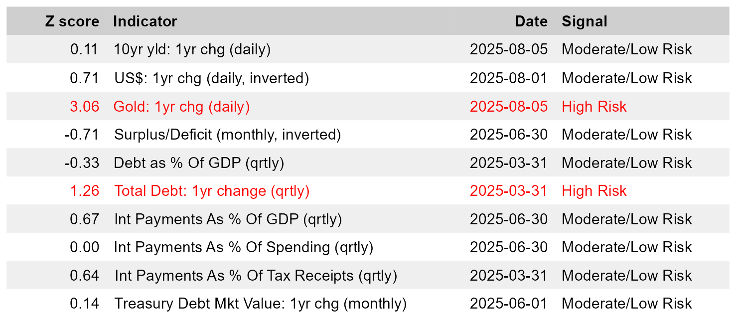 As for data published to date, the tariffs may have reduced fiscal risk a notch as the monthly deficit retreated in the second quarter to a relatively moderate/low risk state following Q1’s high risk profile for this data, based on TMC Research’s modeling.